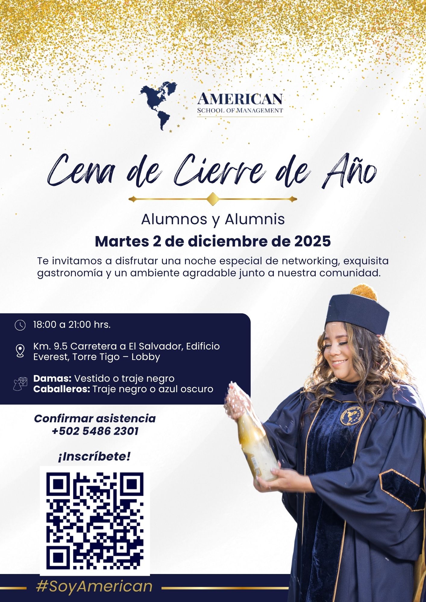 Nos complace invitarte a la Cena de Fin de Año 2025 de American School of Management, un evento diseñado para celebrar los logros compartidos, fortalecer lazos y disfrutar de una noche especial de networking, exquisita gastronomía y un ambiente excepcional.